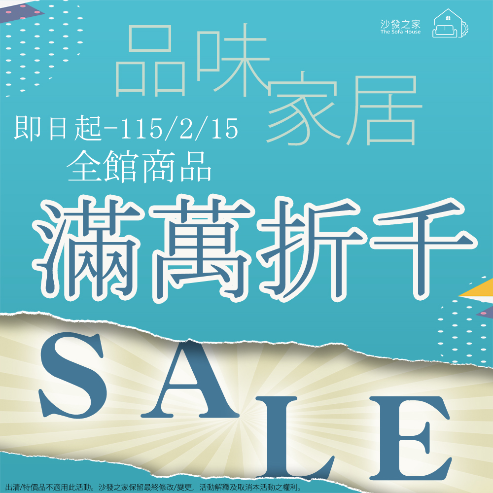品味家居 全館商品 滿萬折千 買越多,省越多 全門市皆適用此活動 【門市商品更豐富,歡迎來店參觀體驗】 *限同一訂單/地址,當次優惠。 *此活動不得累計/併用,特價/出清福利品項不適用本活動。 *沙發之家保留最終修改/變更、活動解釋及取消本活動之權利。